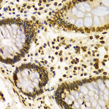Immunohistochemistry of paraffin-embedded Human colon using LMNA antibody at dilution of 1:100 (x400 lens).