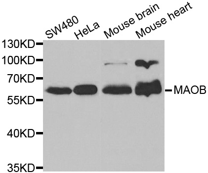 The MAOB gene encodes a 520-amino acid protein with a molecular mass of 58.8 kD and shows 70% amino acid identity to MAOA. MAOA and MAOB are present in the outer mitochondrial membrane in the central nervous system and peripheral tissues.A comparison of highly purified human placental MAOA and human liver MAOB revealed that the A form of the enzyme is larger by 2 kDa and only one potential N-glycosylation site exists in each protein, with each site in a different relevant position(PMID:3387449). This antibody is specific to MAOB.
