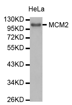 The MCM2-7 complex forms the core of the replicative helicase which acts as the molecular motor that uses ATP binding and hydrolysis to fuel the unwinding of double-stranded DNA at the replication fork in eukaryotes. This complex is the putative replicative helicase essential for 'once per cell cycle' DNA replication initiation and elongation in eukaryotic cells. MCM2, also named CDCL1 and BM28, is a human nuclear protein that plays an important role in 2 crucial steps of the cell cycle, namely, onset of DNA replication and cell division.