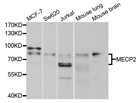 Western blot analysis of extracts of various cell lines, using MECP2 antibody.