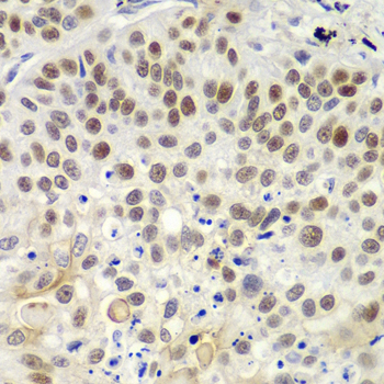 Immunohistochemistry of paraffin-embedded human lung cancer using MSH6 antibody at dilution of 1:100 (400x lens).