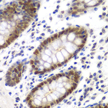 Immunohistochemistry of paraffin-embedded human colon using MSH6 antibody at dilution of 1:100 (400x lens).