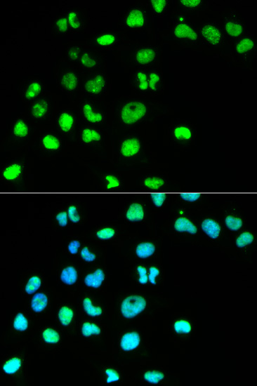 Immunofluorescence analysis of HeLa cell using MSH6 antibody. Blue: DAPI for nuclear staining.