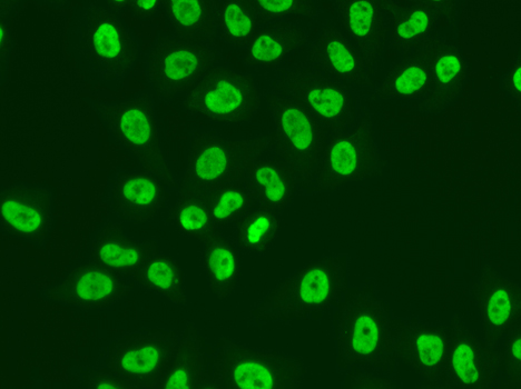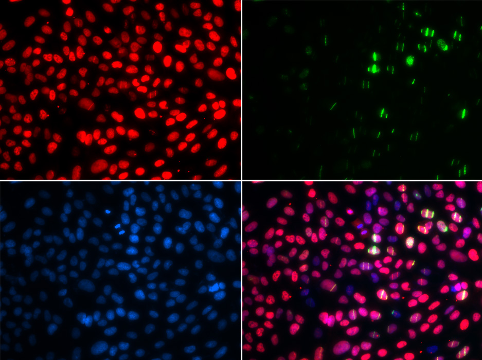 Immunofluorescence analysis of GFP-RNF168 transgenic U2OS cell using MSH6 antibody. Green:GFP-RNF168 fusion protein expression for DNA damage marker.Blue: DAPI for nuclear staining.RNF168(GFP) can be used to mark cells damaged by UV-A laser for they always gather around DNA damage region.