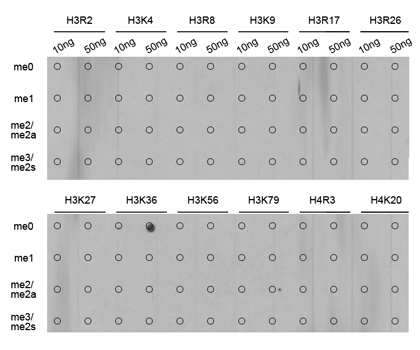 Dot-blot analysis of all sorts of methylation peptides using H3K36me1 antibody.