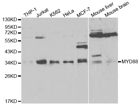 Members of the Toll-like receptor (TLR) family, named for the closely related Toll receptor in Drosophila, play a pivotal role in innate immune responses (1-3). TLRs recognize conserved motifs found in various pathogens and mediate defense responses. Triggering of the TLR pathway leads to the activation of NF-κB and subsequent regulation of immune and inflammatory genes. The TLRs and members of the IL-1 receptor family share a conserved stretch of approximately 200 amino acids known as the TIR domain. Upon activation, TLRs associate with a number of cytoplasmic adaptor proteins containing TIR domains including MyD88 (myeloid differentiation factor), MAL/TIRAP (MyD88-adaptor-like/TIR-associated protein), TRIF (Toll-receptor-associated activator of interferon), and TRAM (Toll-receptor-associated molecule). This association leads to the recruitment and activation of IRAK1 and IRAK4, which form a complex with TRAF6 to activate TAK1 and IKK. Activation of IKK leads to the degradation of IκB that normally maintains NF-κB inactivity by sequestering it in the cytoplasm.MyD88 was originally isolated as a myeloid differentiation primary response gene that is rapidly induced upon IL-6 stimulated differentiation of M1 myeloleukemic cells into macrophages (4-6). It contains an amino-terminal death domain separated from a carboxyl-terminal TIR domain and functions as an adaptor in TLR/IL-1 receptor signaling (7). The death domain of MyD88 mediates interactions with the IRAK complex triggering a signaling cascade that includes the activation of NF-κB (8,9).