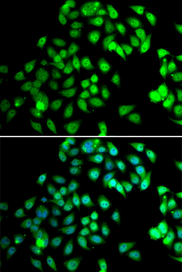 Immunofluorescence analysis of MCF7 cell using NCBP2 antibody. Blue: DAPI for nuclear staining.