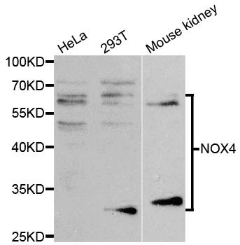 NOX4 (NADPH oxidase 4 ) is a phagocyte-type oxidase, similar to that responsible for the production of large amounts of reactive oxygen species (ROS) in neutrophil granulocytes with resultant antimicrobial activity and it has been postulated to function in the kidney as an oxygen sensor that regulates the synthesis of erythropoietin in the renal cortex.NOX4 has 7 isforms and the molecular weight are 7KDa,26-32KDa,58-67KDa,75-80KDa(PMID:11728818).This antibody is specific to NOX4.
