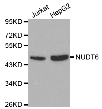 Western blot analysis of extracts of Jurkat and HepG2 cells, using NUDT6 antibody.