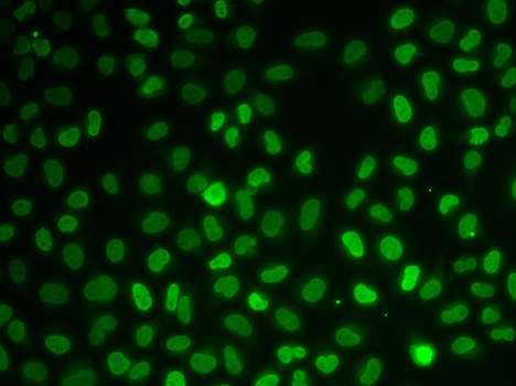 Immunofluorescence analysis of U20S cell using NONO antibody. Blue: DAPI for nuclear staining.