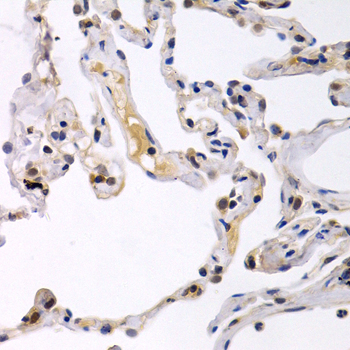 Immunohistochemistry of paraffin-embedded human normal lung using OAS1 antibody at dilution of 1:200 (400x lens).