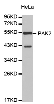 PAK2, also named as PAK65, PAKgamma, p58, PAK-2p27, PAK-2p24 and C-t-PAK2, belongs to the protein kinase superfamily, STE Ser/Thr protein kinase family and STE20 subfamily. PAK2 acts on a variety of targets. PAK2 catalyzes the reaction: ATP + a protein = ADP + a phosphoprotein. PAK2 phosphorylates ribosomal protein S6, histone H4 and myelin basic protein. Full length PAK 2 stimulates cell survival and cell growth. The process is, at least in part, mediated by phosphorylation and inhibition of pro-apoptotic BAD. Caspase-activated PAK-2p34 is involved in cell death response, probably involving the JNK signaling pathway. Cleaved PAK-2p34 seems to have a higher activity than the CDC42-activated form. The antibody has no cross reaction to PAK1 and PAK3.