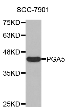Pepsinogen I belongs to the peptidase A1 family. It shows particularly broad specificity and although bonds involving phenylalanine and leucine are preferred, many others are also cleaved to some extent. The gene endoces a 388 amino acid protein with a 15 amino acid signal peptide and 46 amino acid propeptide. This antibody can recognize PGA3(pepsinogen 3), PGA4(pepsinogen 4), PGA5(pepsinogen 5).