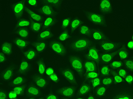 Immunofluorescence analysis of U2OS cell using POLR2J antibody. Blue: DAPI for nuclear staining.