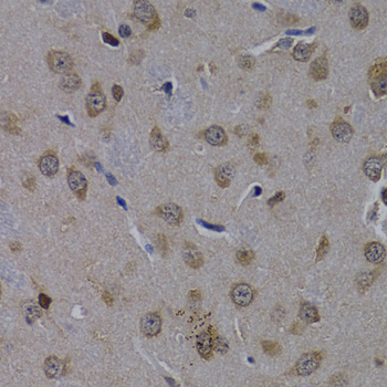Immunohistochemistry of paraffin-embedded mouse brain using POLR2L antibody at dilution of 1:200 (400x lens).