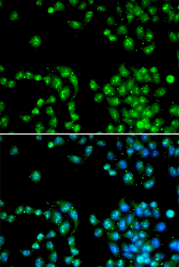 Immunofluorescence analysis of HeLa cell using POLR2L antibody. Blue: DAPI for nuclear staining.