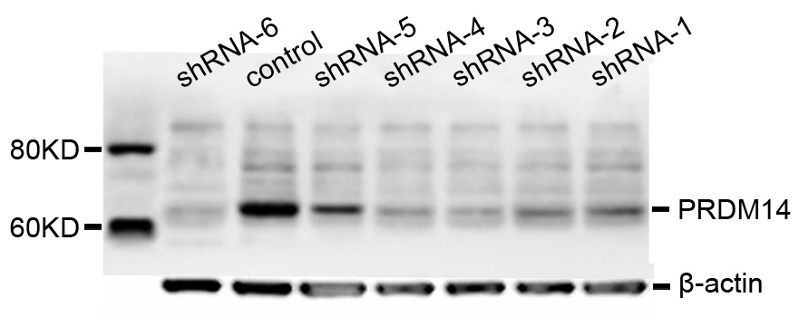 Western blot analysis of various groups from PA-1 cell line, using PRDM14 antibody. ShRNA-1, shRNA-2, shRNA-3, shRNA-4, shRNA-5, shRNA-6 show knock-down samples which are transfected by different shRNAs targeting PRDM14. Control represents the untreated one.