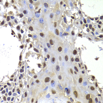 Immunohistochemistry of paraffin-embedded human well-differentiated squamous skin carcinoma using PRDM14 antibody at dilution of 1:100 (x400 lens).