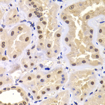 Immunohistochemistry of paraffin-embedded human kidney using PRDM14 antibody at dilution of 1:100 (x400 lens).