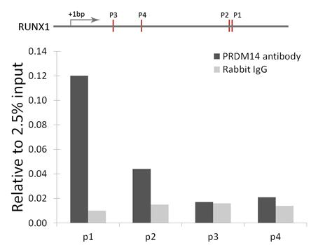 Chromatin immunoprecipitation analysis of RUNX1 gene from 293 cell line, using PRDM14 antibody and rabbit IgG. P1, P2, P3 and P4 were four probes located on RUNX1 gene as the schematic diagram illustrated. The amount of immunoprecipitated DNA was checked by quantitative PCR. Histogram was constructed by the ratios of the immunoprecipitated DNA to the input.