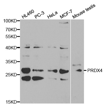 PRDX4(Peroxiredoxin-4) is also named as AOE37-2, Prx-IV and belongs to the AhpC/TSA family. PRDX4 is associated with acrosome formation during rat spermatogenesis and has a protective role in the male reproductive tract, because the phenotype of mice lacking this isoform includes testicular atrophy and increased sperm DNA damage(PMID:20864641). It is initially synthesized as a membrane-binding 31-kDa protein and processed into a 27-kDa secretory form and is discarded with the residual bodies(PMID:19208552). PRDX4 is a pentamer of dimers(PMID:23025503). This antibody is speific to PRDX4.