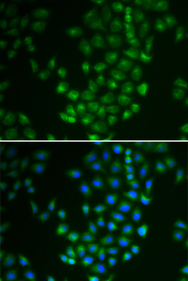Immunofluorescence analysis of U2OS cell using PRKACB antibody. Blue: DAPI for nuclear staining.