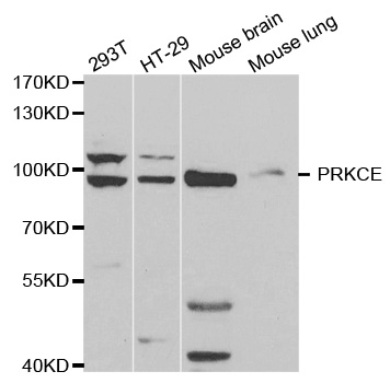 Western blot analysis of extracts of various cell lines, using PRKCE antibody.