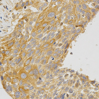 Immunohistochemistry of paraffin-embedded human esophageal cancer using PRKCE antibody at dilution of 1:200 (x400 lens).