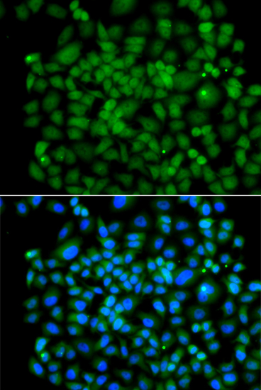 Immunofluorescence analysis of A549 cell using PSMB8 antibody. Blue: DAPI for nuclear staining.