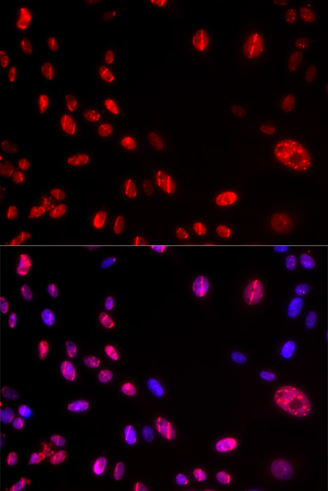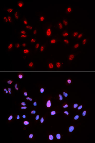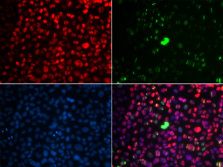 Immunofluorescence analysis of U2OS cell using Phospho-ATM-S1981 antibody. Blue: DAPI for nuclear staining. DNA damage by a UV-A laser.