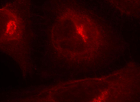 Immunofluorescence staining of methanol-fixed Hela cells showing cytoplasmic staining using Phospho-GSK3A-S21 antibody.