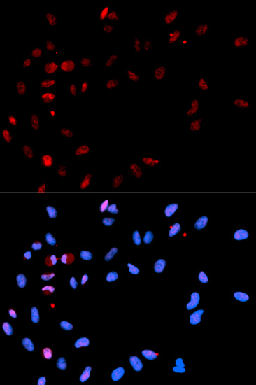 Immunofluorescence analysis of U2OS cell using Phospho-Histone H2A.x-S139 antibody. Blue: DAPI for nuclear staining.