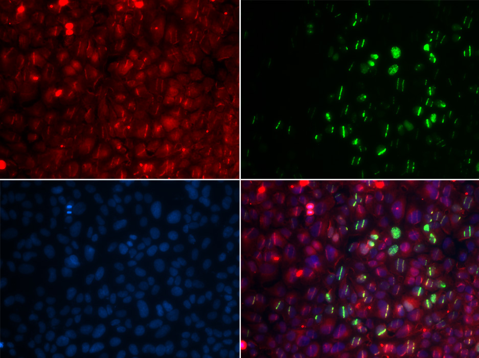 Immunofluorescence analysis of GFP-RNF168 trangenic U2OS cell using RAD18 antibody. Green:GFP-RNF168 fusion protein expression for DNA damage marker.Blue: DAPI for nuclear staining.RNF168(GFP) can be used to mark cells damaged by UV-A laser for they always gather around DNA damage region.