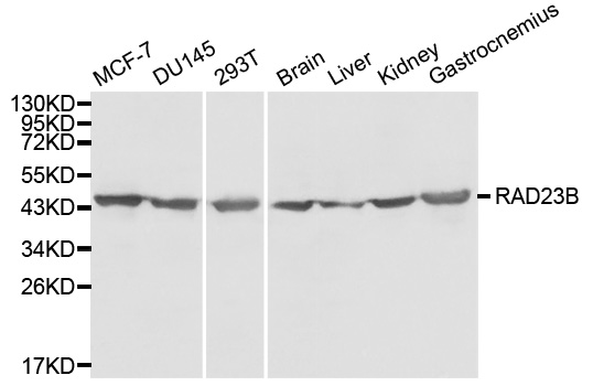 Western blot analysis of extracts of various cells, using RAD23B antibody.
