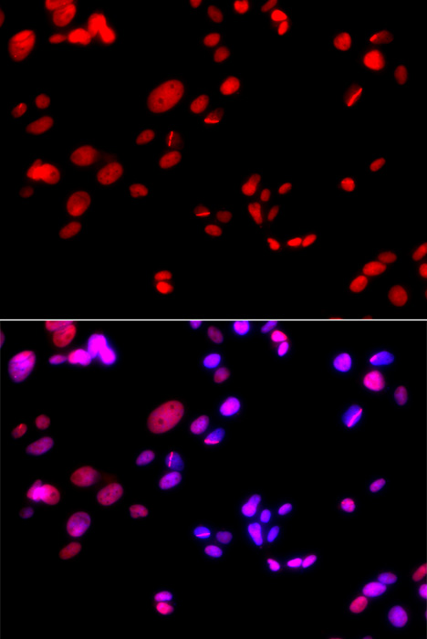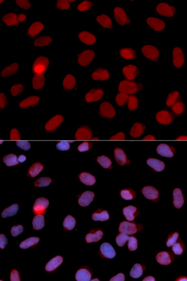 Immunofluorescence analysis of U2OS cell using RPA2 antibody. Blue: DAPI for nuclear staining.