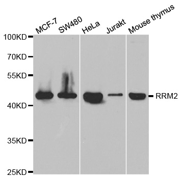 Western blot analysis of extracts of various cell lines, using RRM2 antibody.