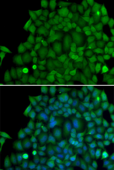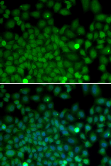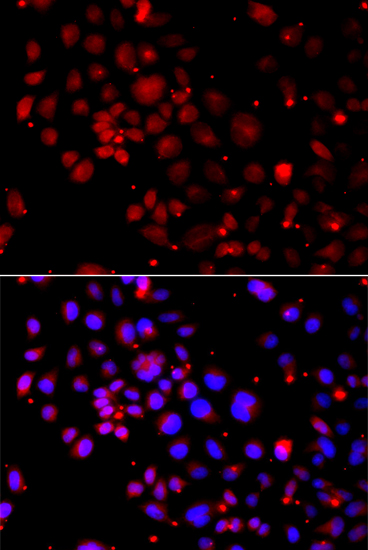 Immunofluorescence analysis of A549 cell using SNAI2 antibody. Blue: DAPI for nuclear staining.