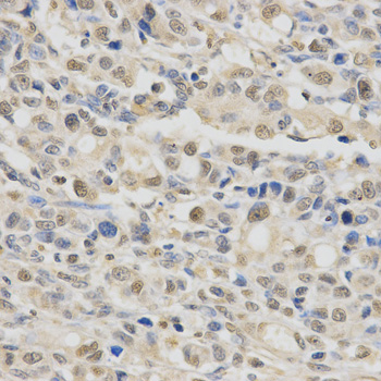 Immunohistochemistry of paraffin-embedded human stomach cancer using SPHK1 antibody at dilution of 1:200 (x400 lens).