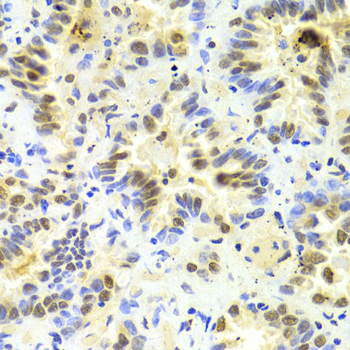Immunohistochemistry of paraffin-embedded human lung cancer using SRSF1 antibody at dilution of 1:100 (x400 lens).