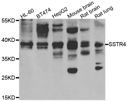 Somatostatin acts at many sites to inhibit the release of many hormones and other secretory proteins. The biologic effects of somatostatin are probably mediated by a family of G protein-coupled receptors that are expressed in a tissue-specific manner. SSTR4 is a member of the superfamily of receptors having seven transmembrane segments and is expressed in highest levels in fetal and adult brain and lung.