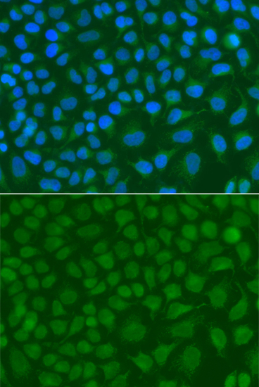 Immunofluorescence analysis of A549 cell using SSX5 antibody. Blue: DAPI for nuclear staining.