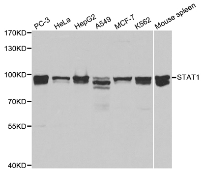 The Stat1 transcription factor is activated in response to a large number of ligands (1) and is essential for responsiveness to IFN-α and IFN-γ (2,3). Phosphorylation of Stat1 at Tyr701 induces Stat1 dimerization, nuclear translocation, and DNA binding (4). Stat1 protein exists as a pair of isoforms, Stat1α (91 kDa) and the splice variant Stat1β (84 kDa). In most cells, both isoforms are activated by IFN-α, but only Stat1α is activated by IFN-γ. The inappropriate activation of Stat1 occurs in many tumors (5). In addition to tyrosine phosphorylation, Stat1 is also phosphorylated at Ser727 through a p38 mitogen-activated protein kinase (MAPK)-dependent pathway in response to IFN-α and other cellular stresses (6). Serine phosphorylation may be required for the maximal induction of Stat1-mediated gene activation.