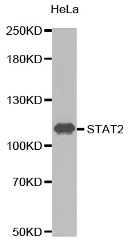 STAT2, also named as p113, belongs to the transcription factor STAT family. It is a signal transducer and activator of transcription that mediates signaling by type I IFNs (IFN-alpha and IFN-beta). Following type I IFN binding to cell surface receptors, Jak kinases (TYK2 and JAK1) are activated, leading to tyrosine phosphorylation of STAT1 and STAT2. The phosphorylated STATs dimerize and associate with ISGF3G/IRF-9 to form a complex termed ISGF3 transcription factor, that enters the nucleus. ISGF3 binds to the IFN stimulated response element (ISRE) to activate the transcription of interferon stimulated genes, which drive the cell in an antiviral state. It also interacts with CRSP2, CRSP6, Simian virus 5 protein V, rabies virus phosphoprotein, IFNAR1 and IFNAR2. Its interaction with dengue virus NS5 inhibits the phosphorylation of STAT2, and, when all viral proteins are present (polyprotein), STAT2 is targeted for degradation. This antibody is a rabbit polyclonal antibody raised against residues near the C terminus of human STAT2.