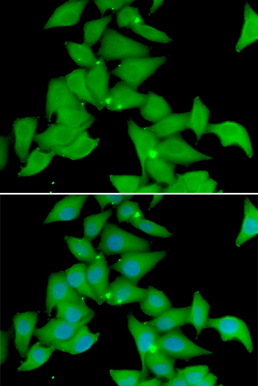 Immunofluorescence analysis of U20S cell using STK3 antibody. Blue: DAPI for nuclear staining.