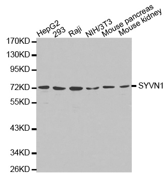 HRD1is also named as SYVN1(Synovial apoptosis inhibitor 1) , KIAA1810. It acts as an E3 ubiquitin-protein ligase which accepts ubiquitin specifically from endoplasmic reticulum-associated UBC7 E2 ligase and transfers it to substrates, promoting their degradation. Two distinct binding sites mediate Hrd1 dimerization or oligomerization, one located within the transmembrane region and another within the cytosolic domain. (PMID:19864457).Western blot analysis detected abundant HRD1 expression in liver and kidney. Mouse liver and spleen expressed Hrd1 as an 85-kD protein(PMID:12646171).This antibody is specific to HRD1.
