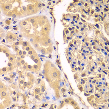 Immunohistochemistry of paraffin-embedded human kidney using TFEB antibody at dilution of 1:100 (x400 lens).