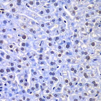 Immunohistochemistry of paraffin-embedded mouse liver using TFEB antibody at dilution of 1:100 (x400 lens).