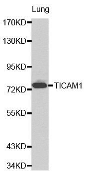 Western blot analysis of lung cell lysate using TICAM1 antibody.