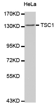 TSC1, also named as KIAA0243 and TSC, is implicated as a tumor suppressor. It is involved in microtubule-mediated protein transport, but this seems to be due to unregulated mTOR signaling. In complex with TSC2, TSC1 inhibits the nutrient-mediated or growth factor-stimulated phosphorylation of S6K1 and EIF4EBP1 by negatively regulating mTORC1 signaling. It seems not to be required for TSC2 GAP activity towards RHEB. It is involved in microtubule-mediated protein transport, but this seems to be due to unregulated mTOR signaling. Defects in TSC1 are the cause of tuberous sclerosis complex (TSC). Defects in TSC1 may be a cause of focal cortical dysplasia of Taylor balloon cell type (FCDBC). The antibody is specific to TSC1.