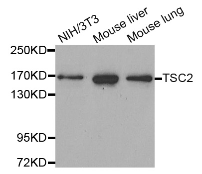 TSC2, also named as TSC4, FLJ43106 and LAM, acts as a GTPase-activating protein (GAP) for the small GTPase RHEB, a direct activator of the protein kinase activity of mTORC1. In complex with TSC1, TSC2 inhibits the nutrient-mediated or growth factor-stimulated phosphorylation of S6K1 and EIF4EBP1 by negatively regulating mTORC1 signaling. TSC2 implicated as a tumor suppressor. It is involved in microtubule-mediated protein transport, but this seems to be due to unregulated mTOR signaling. TSC2 stimulates weakly the intrinsic GTPase activity of the Ras-related proteins RAP1A and RAB5 in vitro. Mutations in TSC2 lead to constitutive activation of RAP1A in tumors. Mutations in either TSC2 or the related TSC1 (hamartin) gene cause tuberous sclerosis complex (TSC), an autosomal dominant disorder characterized by development of multiple, widespread non-malignant tumors. The antibody is specific to TSC2.